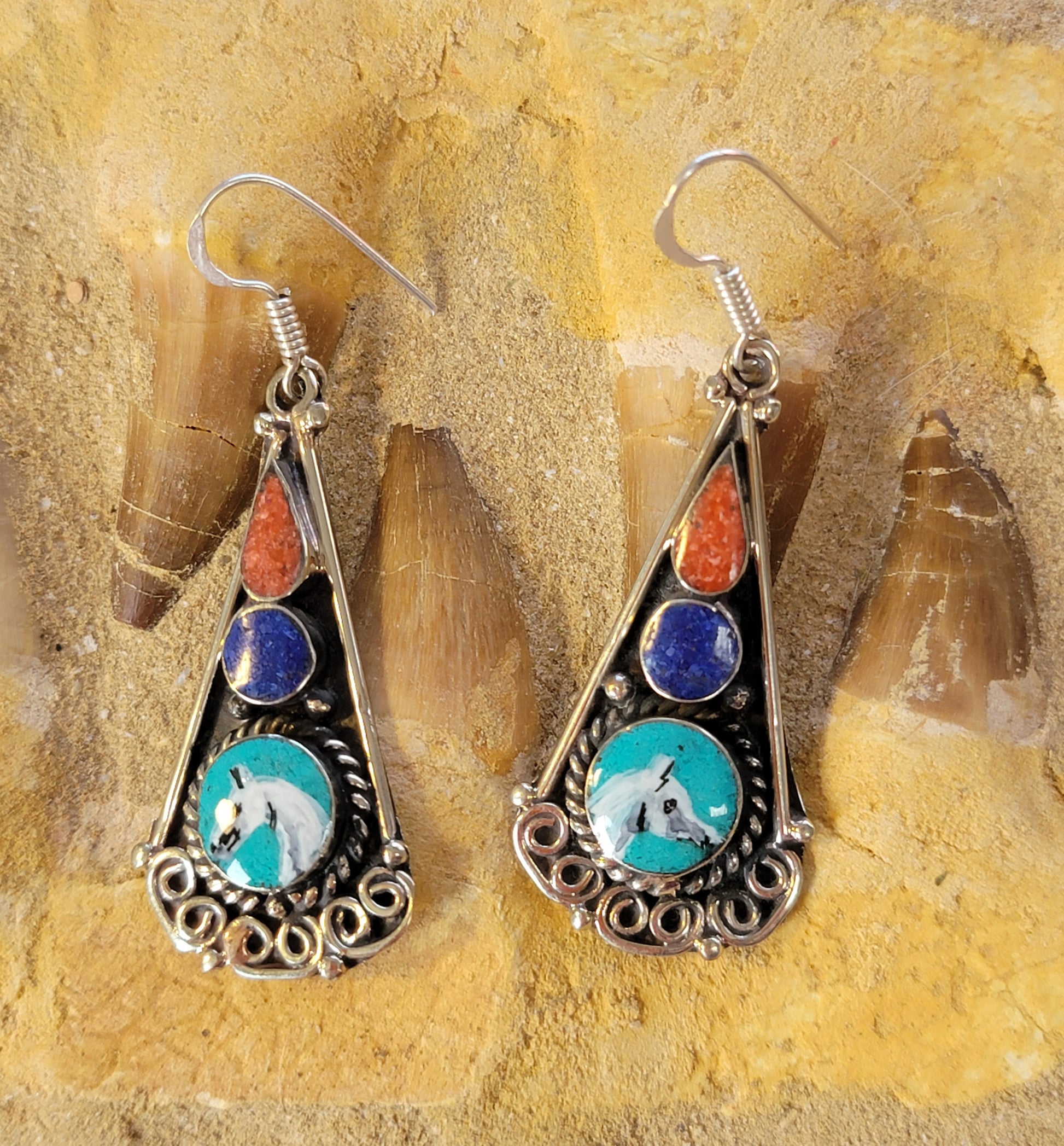These Hand Painted Tribal Arabian Horse Sterling Silver Earrings feature Bedouin tribal designs, incorporating lapis, coral, and turquoise in substantial sterling silver settings. Each earring is meticulously hand-painted with intricate grey Arabian horses, providing a unique aesthetic that combines traditional artistry with contemporary elegance.