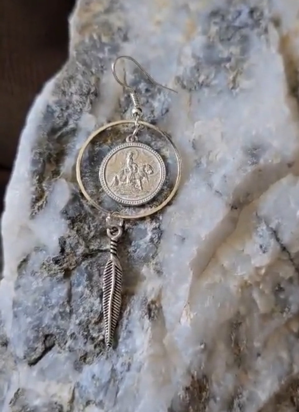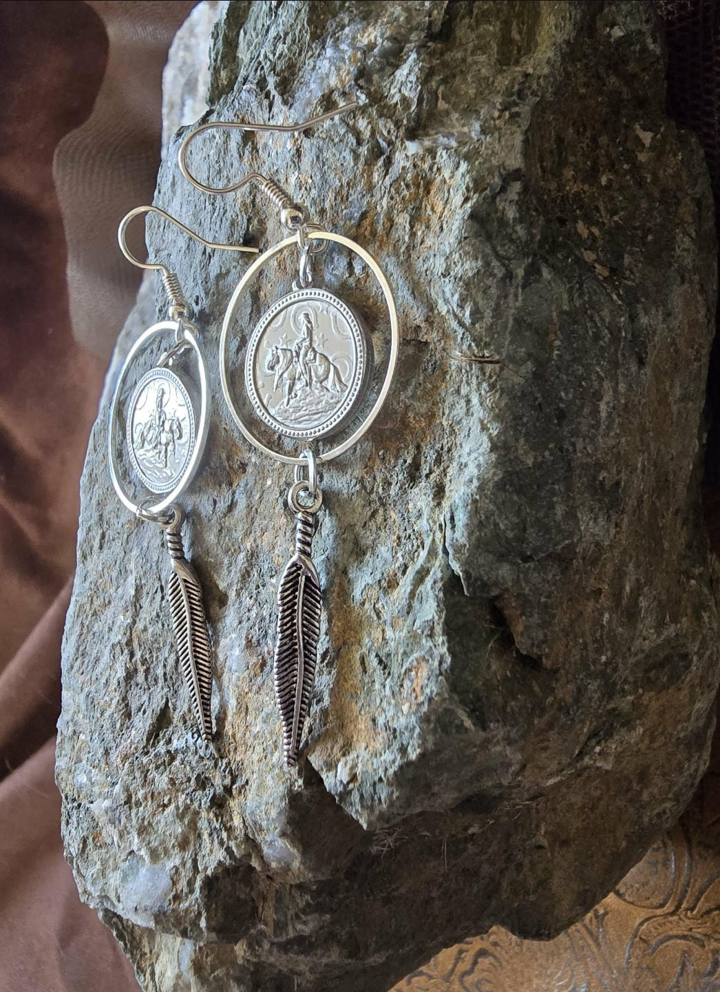 Reining Horse Hoop and Feather Earrings pewter and stainless steel