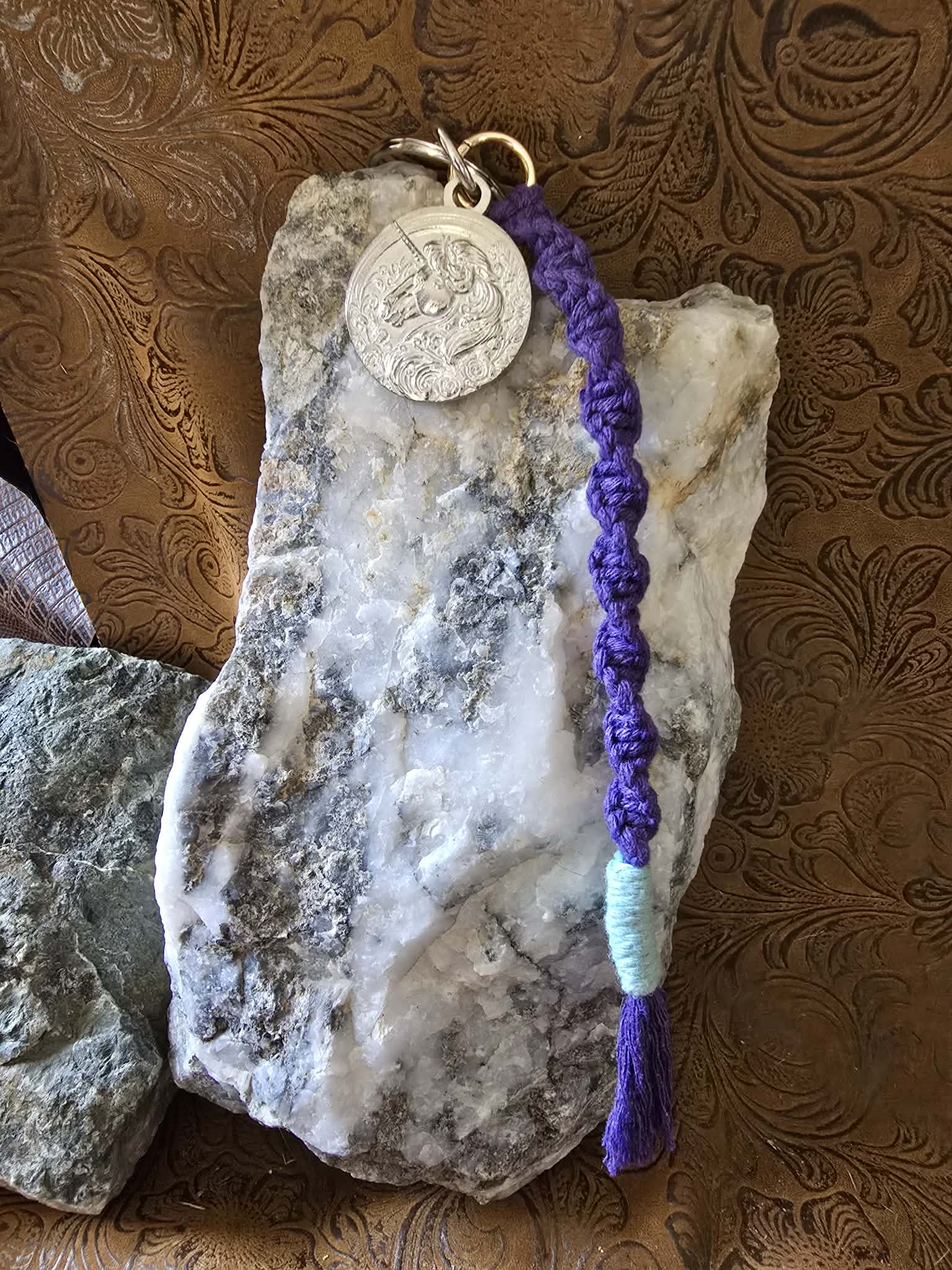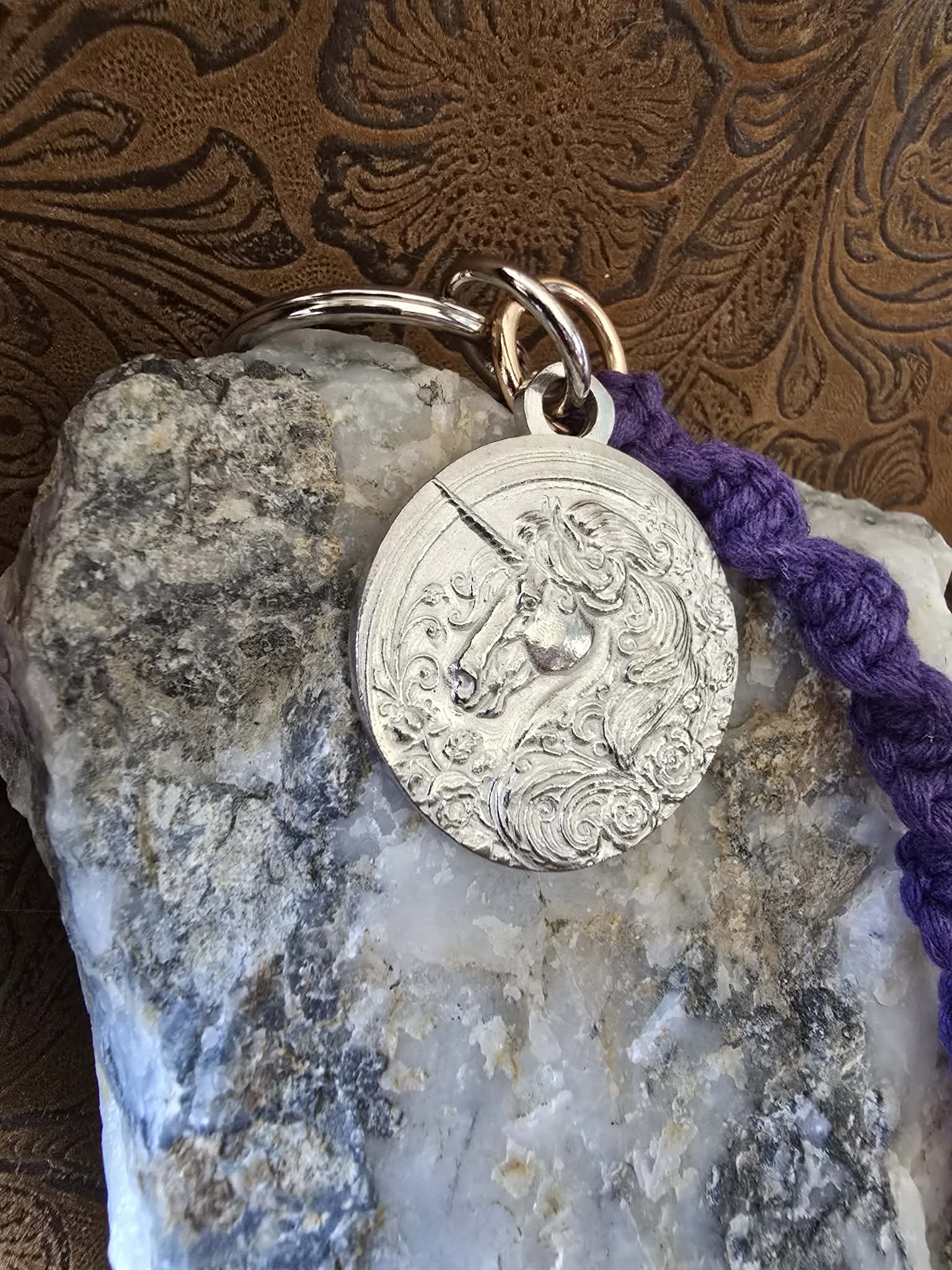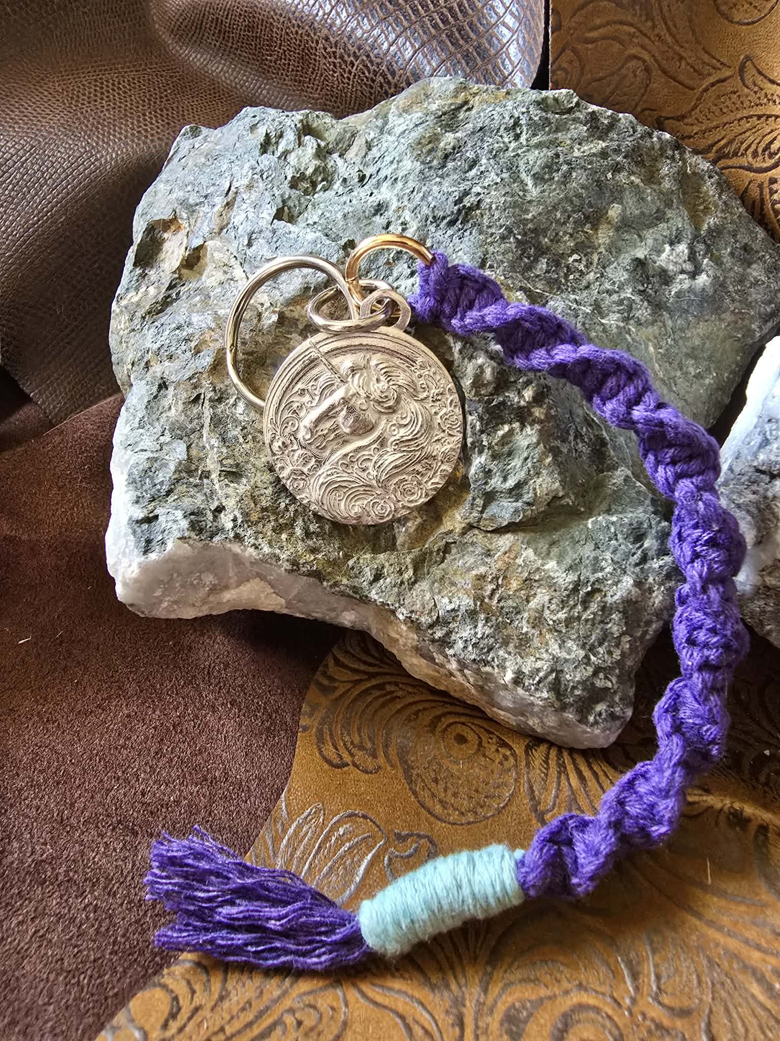 Unlock your inner unicorn with this charming keychain! Featuring a handcrafted pewter unicorn medallion (because who doesn’t need a magical steed in their pocket?), it's paired with a sturdy macrame lanyard that screams "I’ve got style!" Keep your keys safe and your imagination soaring! 🌈✨